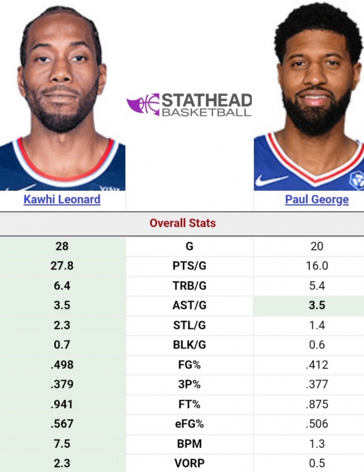 sofascore官网-小卡VS乔治本赛季数据对比:小卡全方面包围 甚至多打了8场